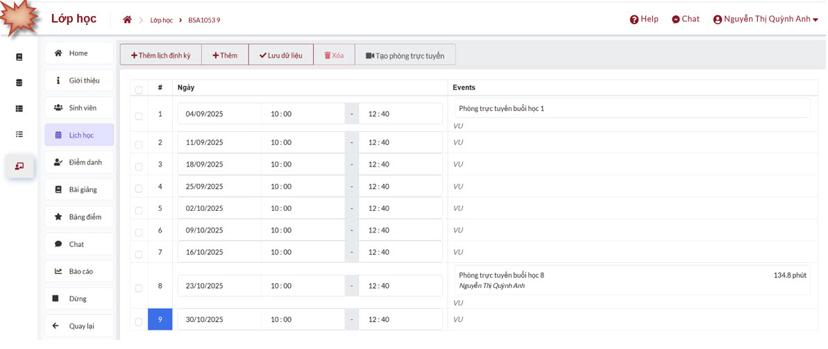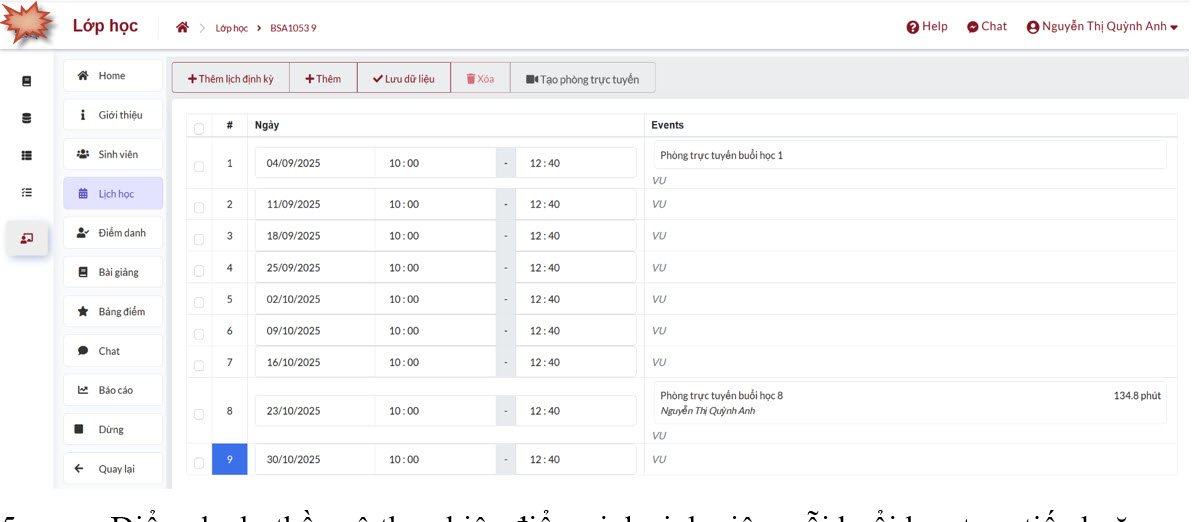 - Lịch học tự động: Đồng bộ từ hệ thống đào tạo, hỗ trợ tạo lớp học trực tuyến