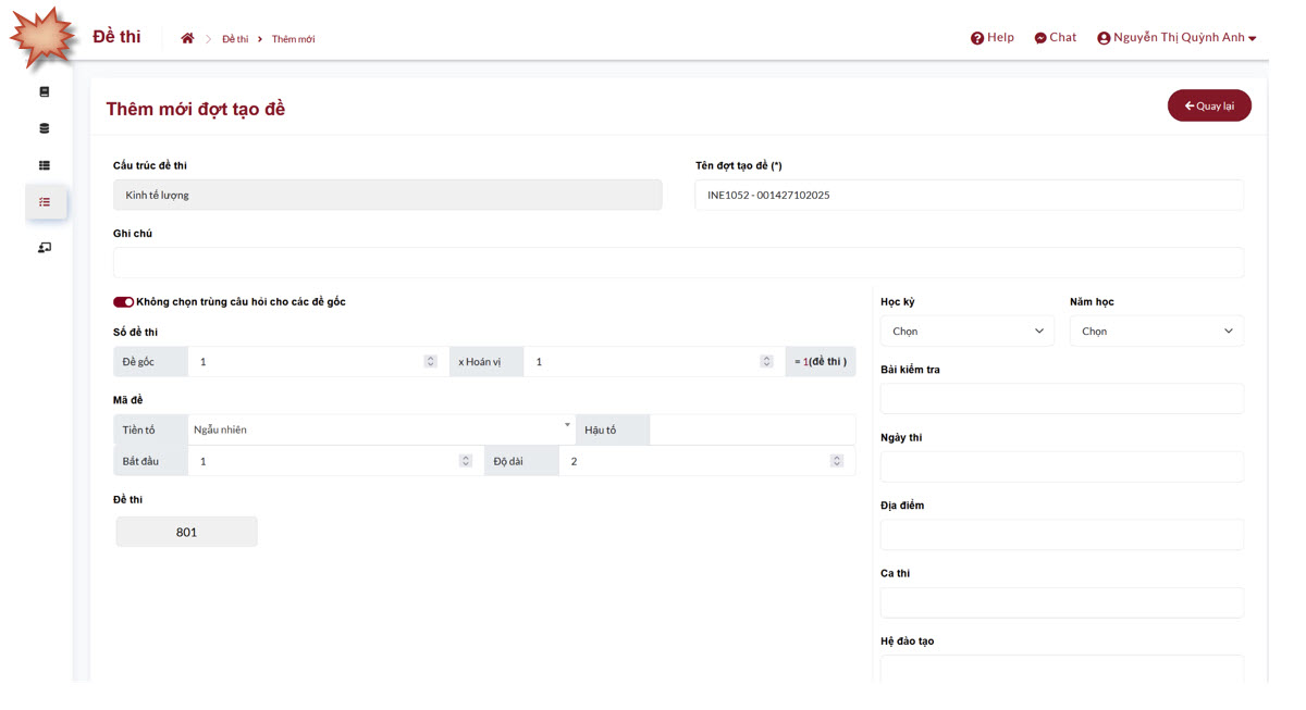 Với module này, giảng viên có thể tạo nhiều mã đề khác nhau một cách tự động dựa trên cấu trúc đã thiết lập. Hệ thống hỗ trợ hoán vị câu hỏi, xuất đề thi ra định dạng PDF hoặc Word, và cho phép chỉnh sửa linh hoạt.