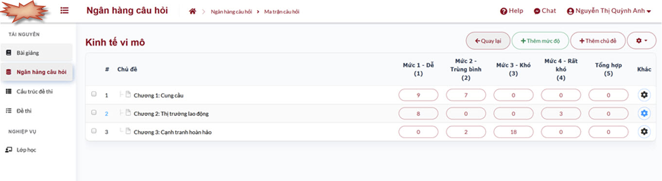 Đây là module giúp giảng viên xây dựng kho câu hỏi phong phú cho việc kiểm tra đánh giá. Hệ thống cho phép phân loại câu hỏi theo nhiều mức độ (dễ, trung bình, khó, rất khó) và theo từng chủ đề cụ thể. Giảng viên có thể tạo câu hỏi trực tiếp trên LMS hoặc tải lên theo mẫu có sẵn, đồng thời có thể chia sẻ và phân quyền quản lý ngân hàng câu hỏi cho đồng nghiệp.